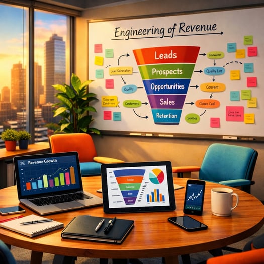 engenharia de receita é a disciplina que une diagnóstico, arquitetura e execução em um sistema de receita previsível, cobrindo toda a jornada b2b: do produto à retenção, do icp ao dashboard de métricas.